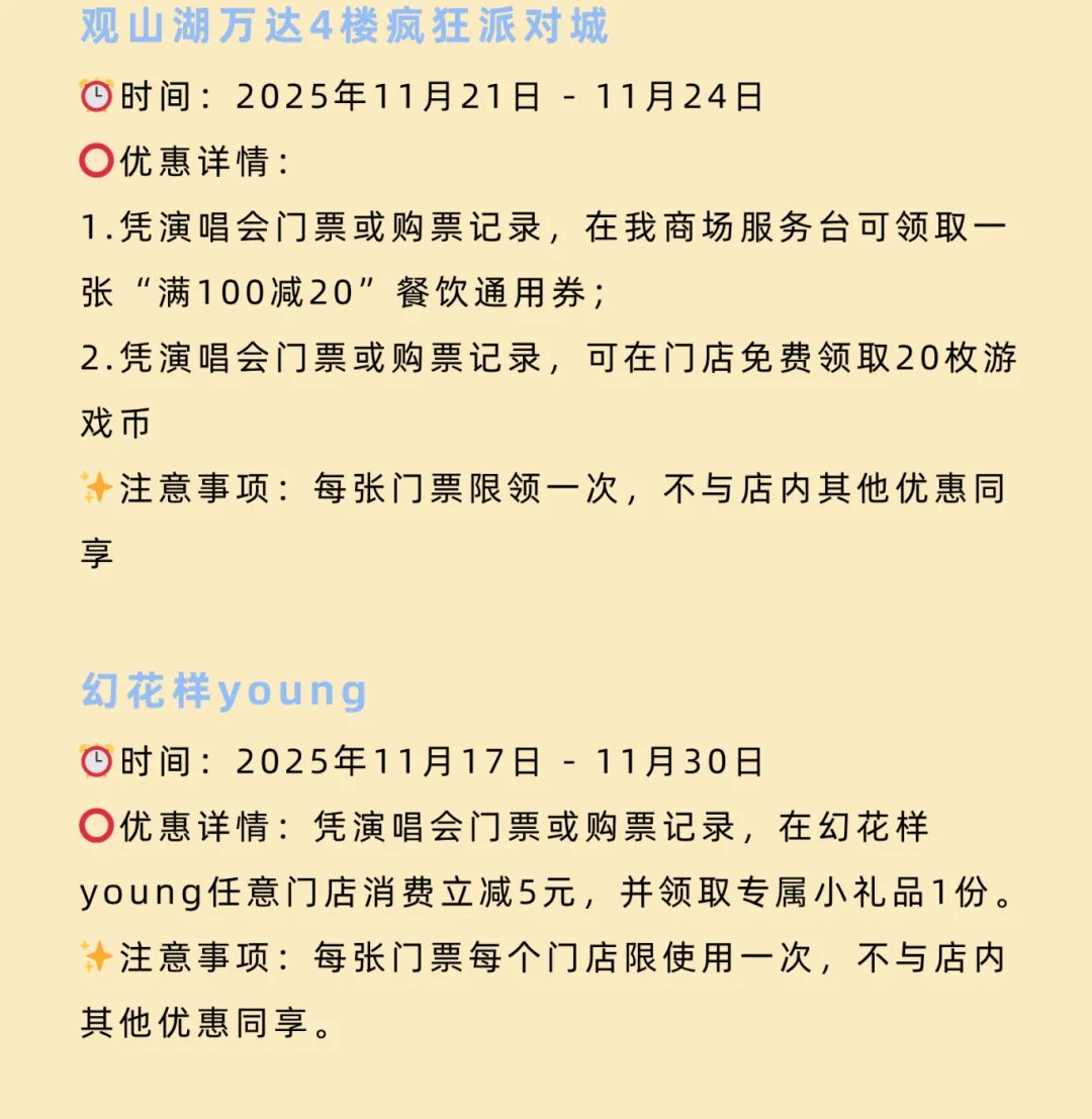2025年11月21日至25日期间,凭时代少年团出道六周年演唱会门票可享受恐龙小镇、天河潭、乌当万象温泉、保利温泉、贵御温泉、乐湾温泉、乌当枫叶谷温泉、息烽南山天沐温泉、息烽温泉疗养院、修文桃源河朵芳阁温泉、清镇四季贵州山地温泉、修文六广河温泉、开阳白马峪温泉门票门市价6折优惠。